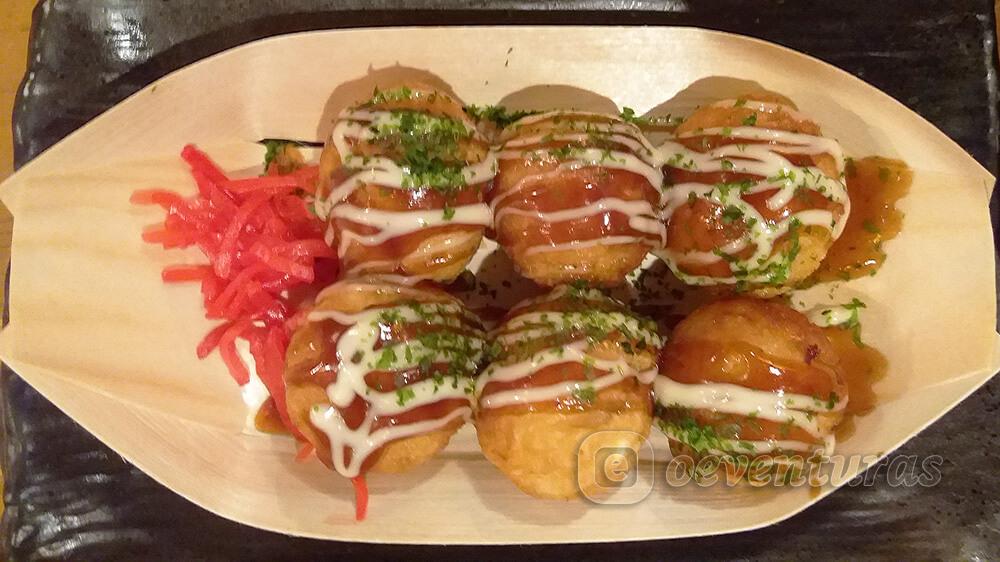 El takoyaki es una comida típica de la región de Kansai. Consiste en una masa de trigo en cuyo interior lleva pulpo y otros ingredientes como cebolla, jengibre… Por arriba le echan salsa para takoyaki y mayonesa, a veces también bonito seco o algas. Por sí sola no es una comida sino que se considera una guarnición o algo para picar.
