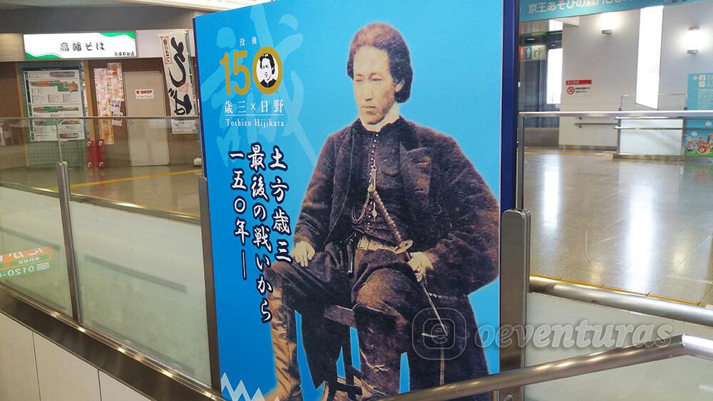 Nuestra primera parada fue la estación Takahatafudo ya que estaba cerca del sello más alejado. Saliendo había un cartel que conmemoraba el 150 aniversario de la muerte de Hijikata con una foto suya. Ya en la calle veíamos también carteles de wifi-gratis con un diseño del Shisengumi.