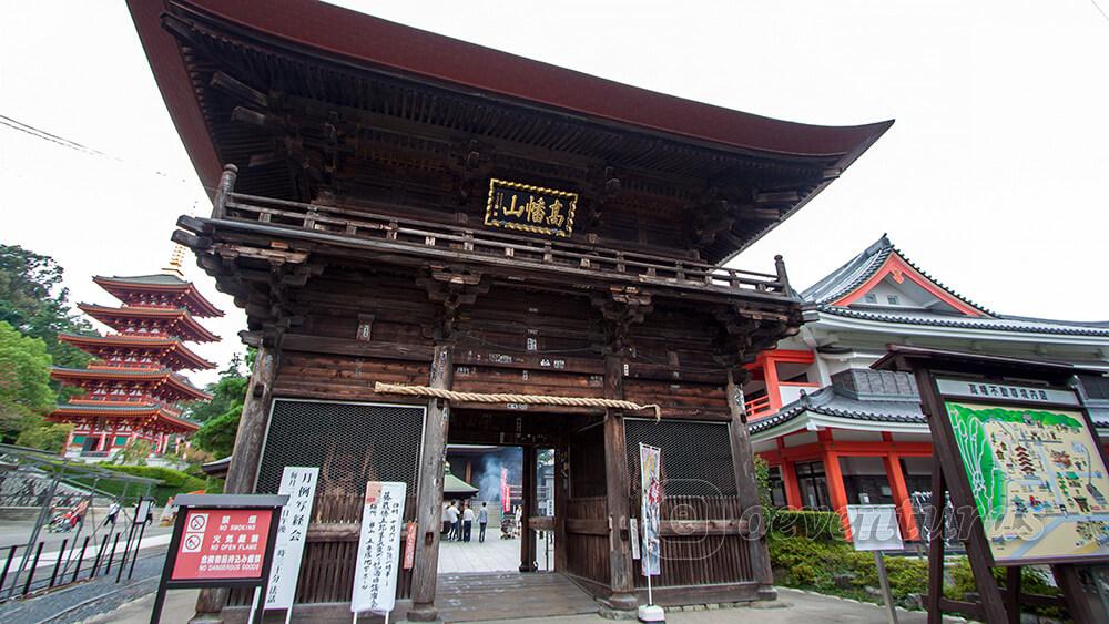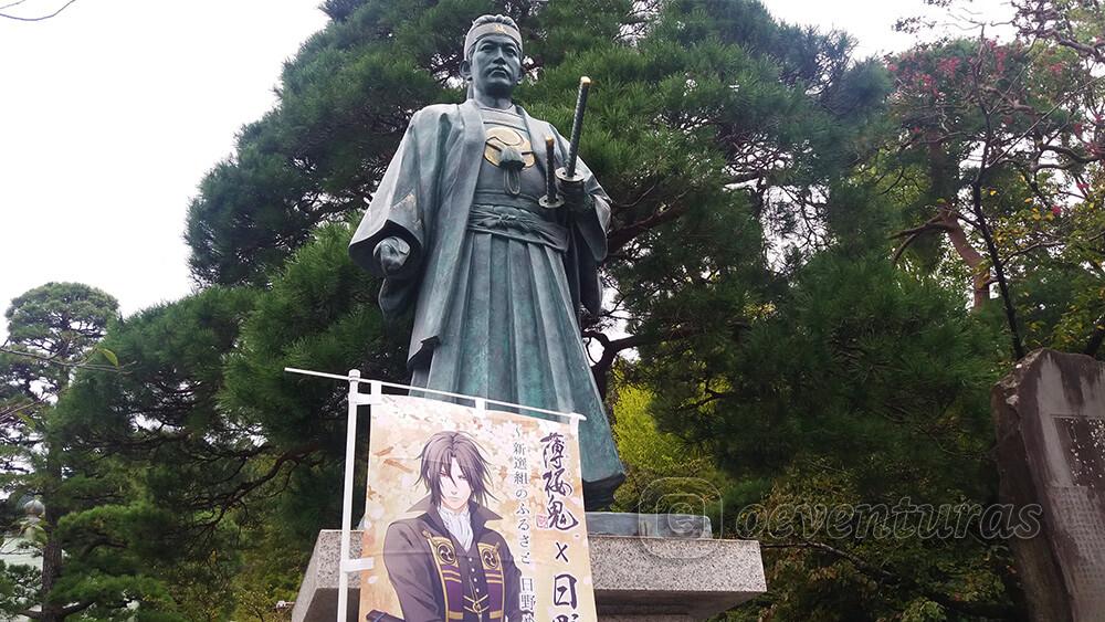 Llegamos a nuestro primer punto: el templo Takahatasan Kongoji. Tras pasar por su enorme entrada de madera, nos acercamos a información y cogimos un panfleto para los sellos, además, pusimos el primero. Tras ello, nos acercamos a la estatua dedicada a Hijikata que estaba al lado de una imagen del Hijikata de Hakuouki.
